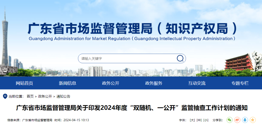 廣東省市場監(jiān)督管理局關(guān)于印發(fā)2024年度“雙隨機、一公開”監(jiān)管抽查工作計劃的通知