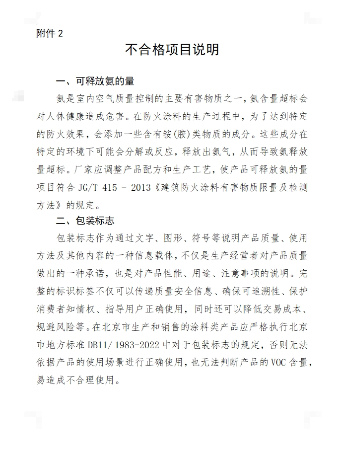 按照《中華人民共和國產(chǎn)品質(zhì)量法》《產(chǎn)品質(zhì)量監(jiān)督抽查管理暫行辦法》等法律、規(guī)章,以及本市產(chǎn)品質(zhì)量監(jiān)督抽查計劃和實施細(xì)則,北京市市場監(jiān)督管理局堅持問題導(dǎo)向,將近年抽查不合格率較高的檢測項目納入實施細(xì)則,聚焦易出問題的經(jīng)營場所和品牌,組織開展了防火涂料產(chǎn)品質(zhì)量監(jiān)督抽查。共抽樣檢驗2組批樣品,檢出2組批包裝標(biāo)志、可釋放氨的量不符合標(biāo)準(zhǔn)。