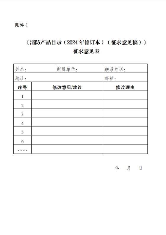 1.《消防產(chǎn)品目錄(2024年修訂本)(征求意見稿)》征求意見表