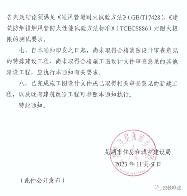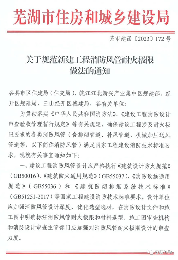 蕪市建函[2023]172號《關(guān)于規(guī)范新建工程消防風管耐火極限做法的通知》