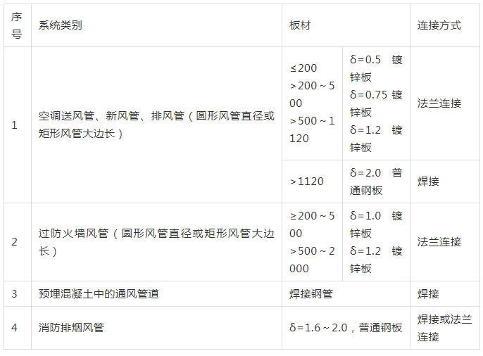 2、風(fēng)管材質(zhì)及連接見下表