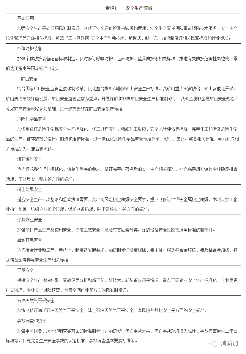 (二)加快推進(jìn)急需短缺和重要標(biāo)準(zhǔn)制修訂。循序漸進(jìn)務(wù)求實(shí)效,按照“先急后緩”原則加強(qiáng)統(tǒng)籌,集中力量加快修訂與人民生命安全關(guān)系最直接的標(biāo)準(zhǔn),爭(zhēng)取早日出臺(tái)、確保有效管用。密切跟蹤研究事故災(zāi)害暴露的標(biāo)準(zhǔn)化短板問(wèn)題,對(duì)標(biāo)落實(shí)法律法規(guī)和應(yīng)急管理標(biāo)準(zhǔn)體系建設(shè)要求,加快重點(diǎn)行業(yè)和關(guān)鍵領(lǐng)域標(biāo)準(zhǔn)立改廢。在安全生產(chǎn)方面,加強(qiáng)基礎(chǔ)通用標(biāo)準(zhǔn),個(gè)體防護(hù)裝備標(biāo)準(zhǔn),事故調(diào)查統(tǒng)計(jì)相關(guān)標(biāo)準(zhǔn),礦山安全、危險(xiǎn)化學(xué)品安全、煙花爆竹安全生產(chǎn)、石油天然氣開采安全標(biāo)準(zhǔn),以及粉塵防爆、涂裝作業(yè)、冶金有色、工貿(mào)安全等領(lǐng)域重要標(biāo)準(zhǔn)制修訂;在消防救援方面,加快制修訂消防救援隊(duì)伍隊(duì)站建設(shè)、裝備建設(shè)、作戰(zhàn)訓(xùn)練,消防通信指揮信息化、消防物聯(lián)網(wǎng)建設(shè)、消防監(jiān)督檢查、消防產(chǎn)品監(jiān)督管理、社會(huì)消防治理、社會(huì)消防技術(shù)服務(wù)管理、火災(zāi)調(diào)查等相關(guān)標(biāo)準(zhǔn);在減災(zāi)救災(zāi)與綜合性應(yīng)急管理方面,加快制修訂應(yīng)急管理術(shù)語(yǔ)、符號(hào)、標(biāo)記和分類等基礎(chǔ)通用標(biāo)準(zhǔn),風(fēng)險(xiǎn)監(jiān)測(cè)和管控標(biāo)準(zhǔn),水旱災(zāi)害應(yīng)急管理標(biāo)準(zhǔn),地震災(zāi)害應(yīng)急救援相關(guān)標(biāo)準(zhǔn),地質(zhì)災(zāi)害應(yīng)急救援相關(guān)標(biāo)準(zhǔn),應(yīng)急裝備標(biāo)準(zhǔn),應(yīng)急管理信息化標(biāo)準(zhǔn),救災(zāi)和物資保障標(biāo)準(zhǔn),應(yīng)急預(yù)案制定和演練、救援現(xiàn)場(chǎng)指揮、專業(yè)應(yīng)急救援力量建設(shè)標(biāo)準(zhǔn),應(yīng)急救援事故災(zāi)害調(diào)查和綜合性應(yīng)急管理評(píng)估統(tǒng)計(jì)規(guī)范標(biāo)準(zhǔn),應(yīng)急救援教育培訓(xùn)標(biāo)準(zhǔn),以及其他防災(zāi)減災(zāi)救災(zāi)和綜合性應(yīng)急管理有關(guān)標(biāo)準(zhǔn)。